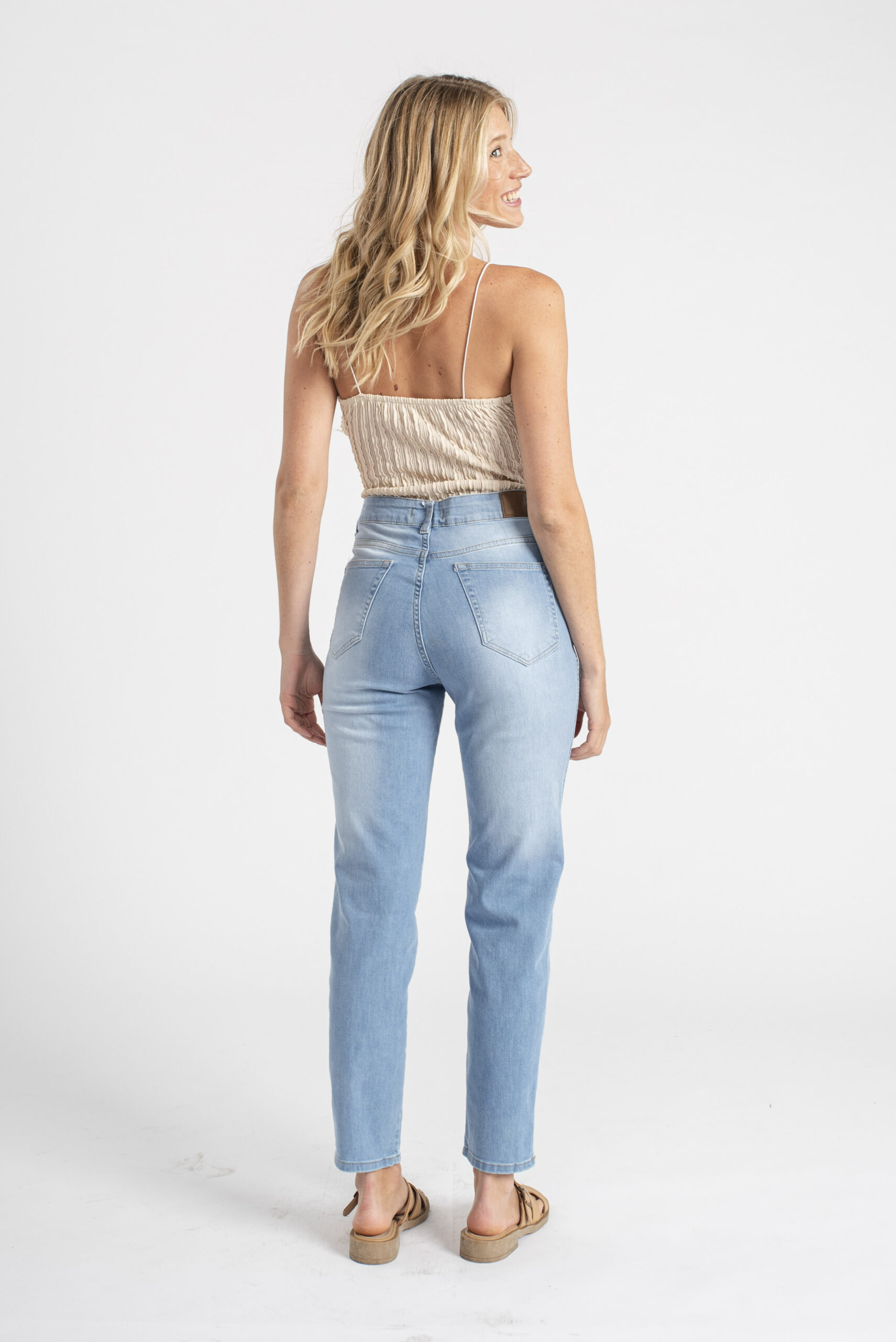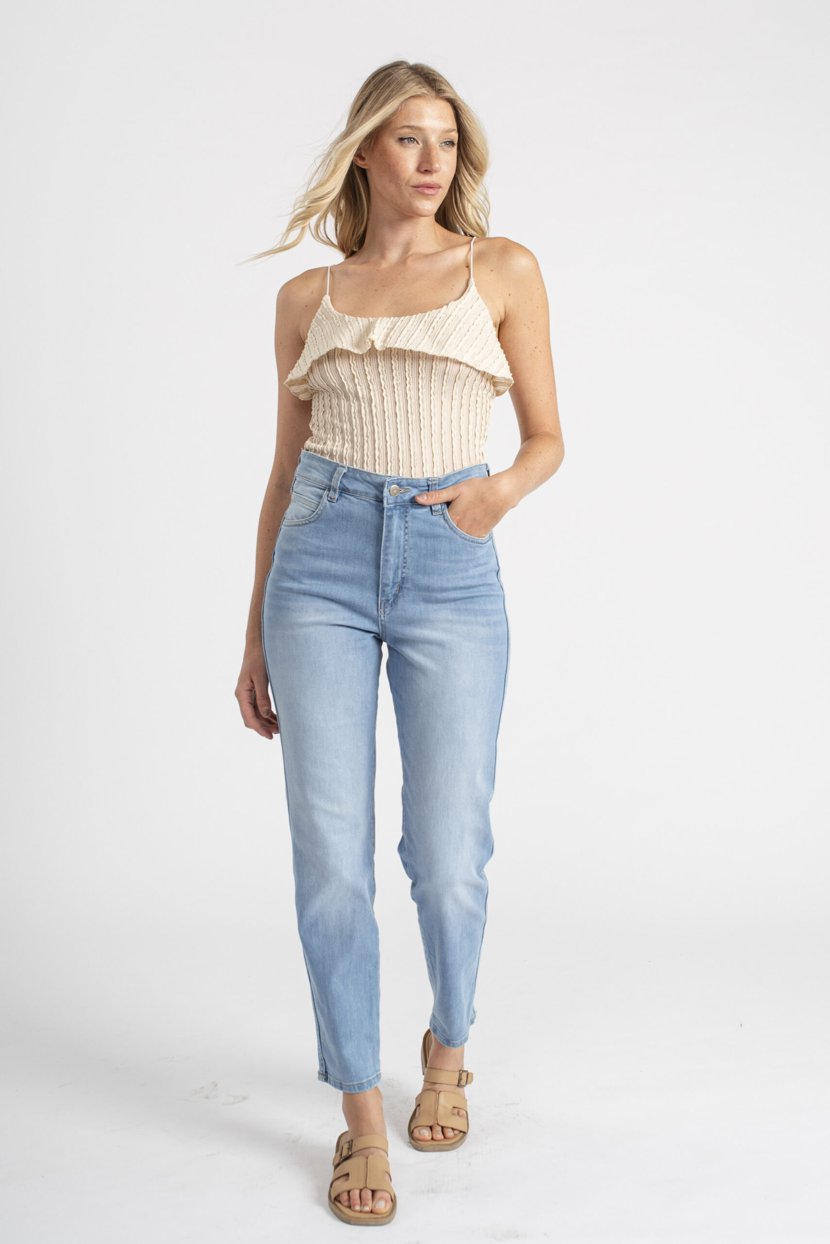 Moldería: normal Tiro: alto Tela: elastizada Lavado: celeste con bigotes