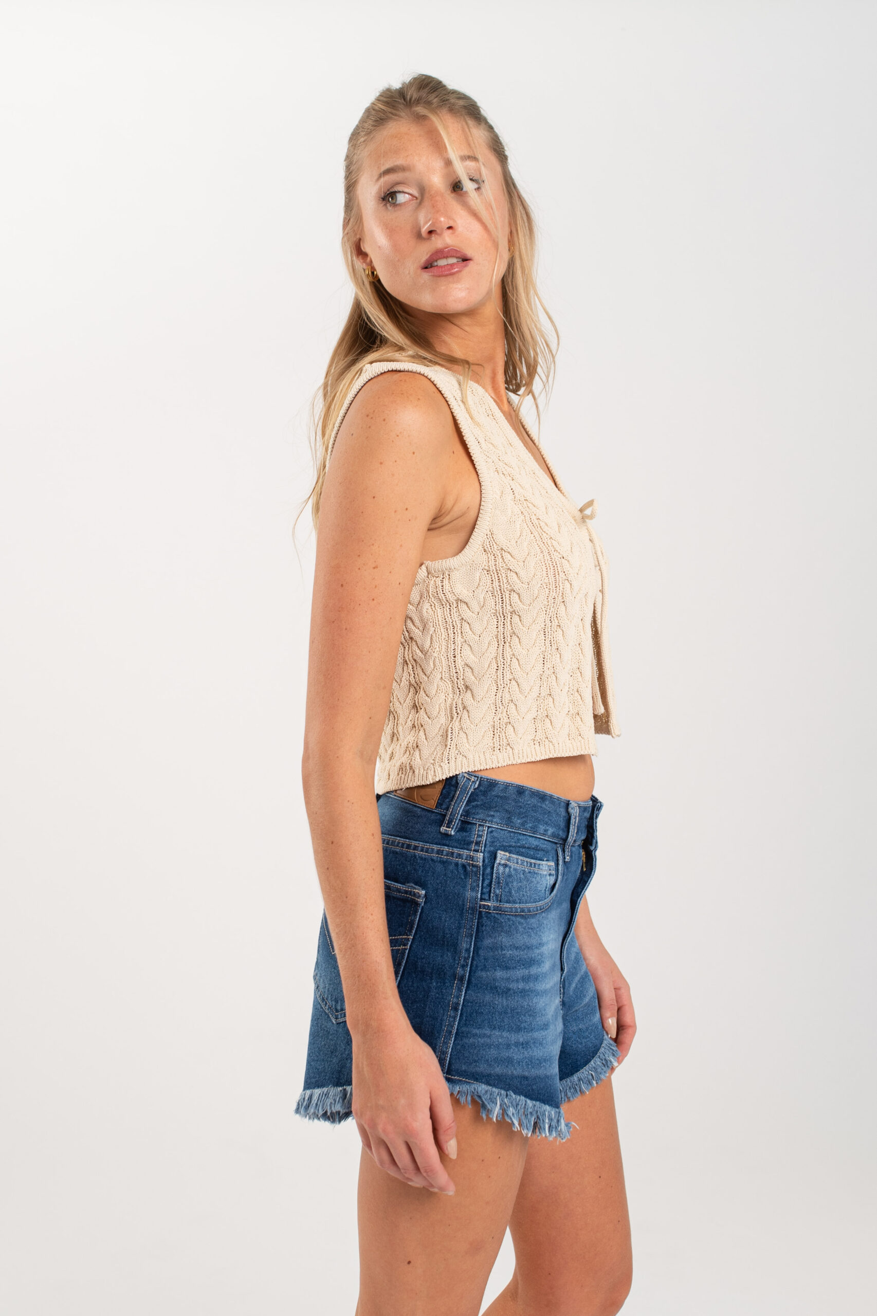 Moldería: normal Tiro: medio/alto Tela: rígida Color: azul localizado con bigotes